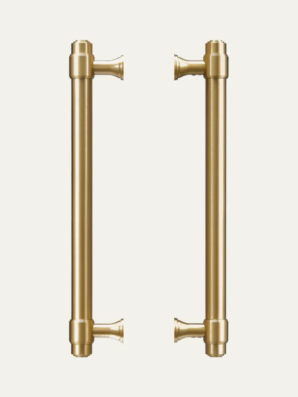 A refined range of solid brass cabinet hardware featuring turned barrel ends and stepped pedestal bases. Available with a T-Knob and pulls in six sizes, offered in Satin Brass, Antique Brass, Satin Nickel, and Unlacquered Brass.
