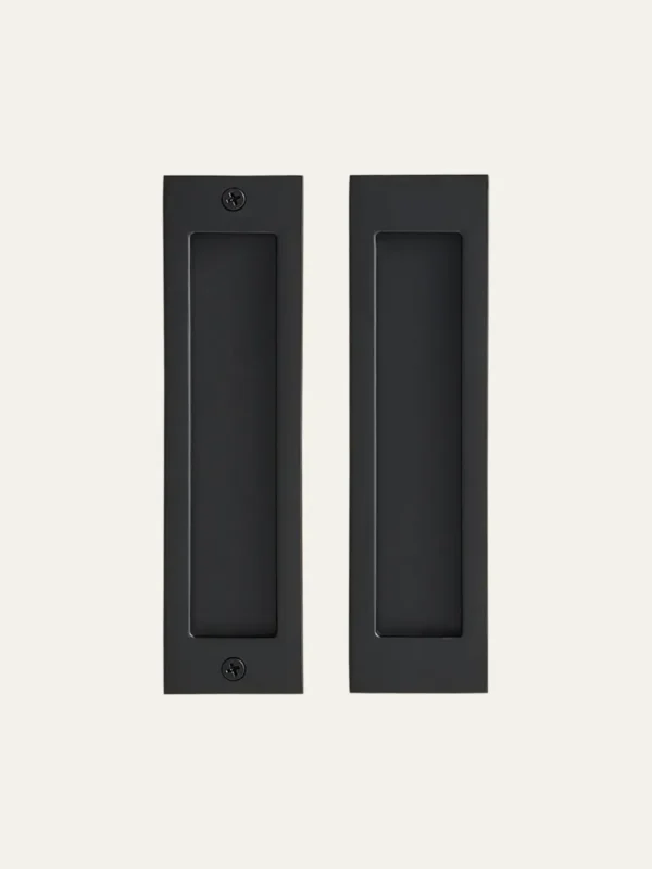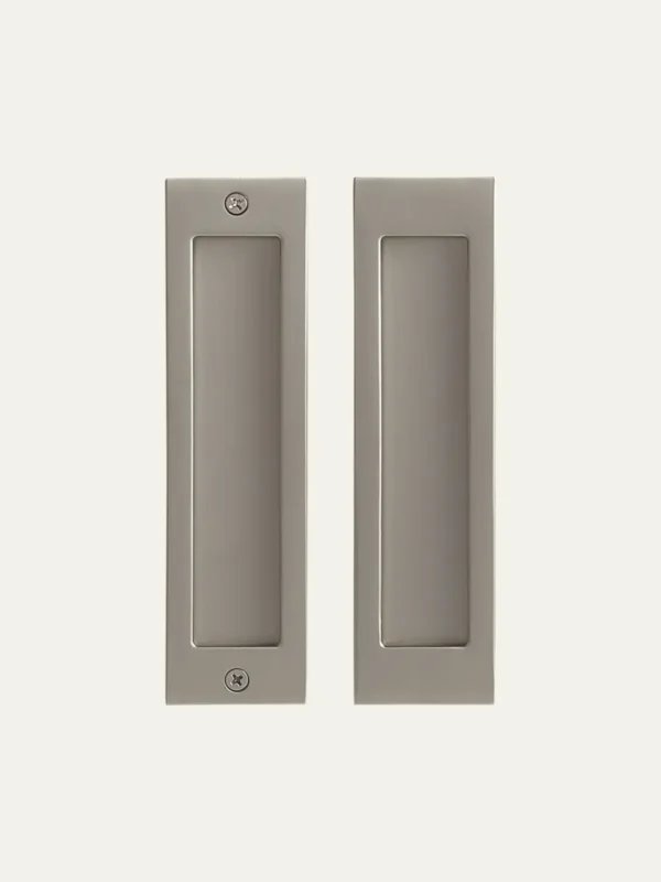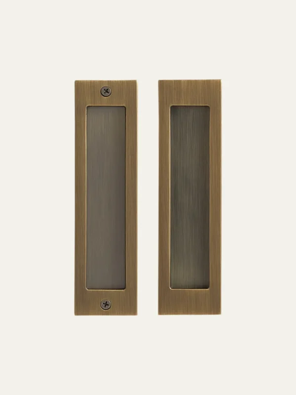 Solid brass sliding door hardware with flush-mount rectangular profiles.