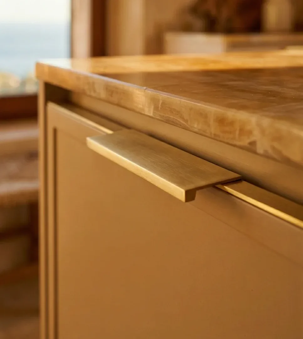 This approach works best with simple shapes. A clean T-bar or a minimal edge pull in a warm finish lets the material speak without the design competing.