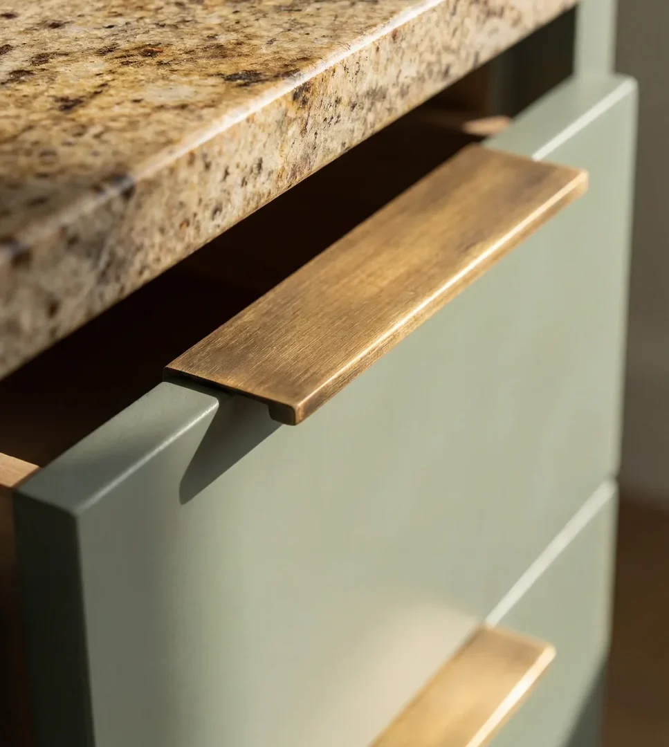 Your dominant metal should appear on the pieces you touch most: cabinet handles, drawer pulls, and the tap. These are the elements that define the kitchen’s character.