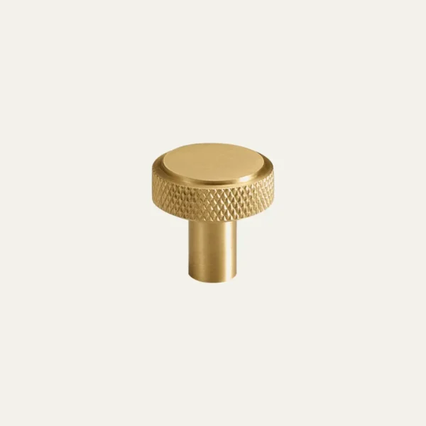 A cylindrical brass knob with diamond knurling around the full circumference and a flat, brushed top. The textured surface provides a confident grip, while the square-shouldered profile adds a contemporary, architectural edge. Available in three diameters to suit different cabinet proportions.