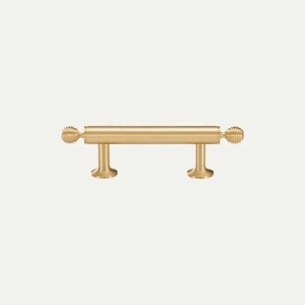 The full-length Amberley pull pairs the beehive finials from the knob with a smooth 12mm round bar on twin pedestal mounts. The reeded ends catch light and shadow in equal measure. Seven sizes cover everything from a narrow spice drawer at 64mm to a full larder door at 320mm. The horizontal proportions make it equally at home on kitchen drawers and bedroom furniture.