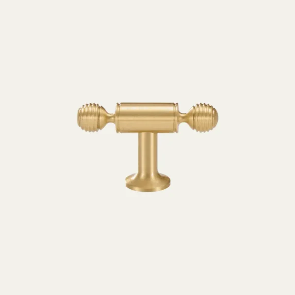 The Amberley T-Bar carries the same turned reeds as the knob, scaled down to barrel-shaped finials on either side of a 12mm round bar. At 55mm across, it sits quietly on a drawer front but gives enough purchase for heavier drawers. Pair it with the Amberley Knob on upper cabinets for a cohesive scheme.