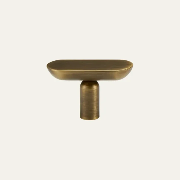 A smooth, sculptural T-bar in solid brass with a distinctive pill-shaped silhouette. The oblong form sits naturally between thumb and forefinger, offering a comfortable, intuitive grip for drawers and smaller cabinet doors.
