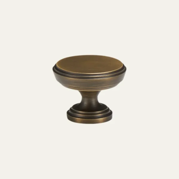 The Ashford Knob pairs a broad, gently domed top with a turned pedestal base featuring crisp stepped rings. The proportions are generous without being heavy - at 30mm across, it suits kitchen cabinets, drawers, and bedroom furniture equally well. Each knob is turned from a single billet of solid brass and hand-finished to preserve the crispness of every lathe line.