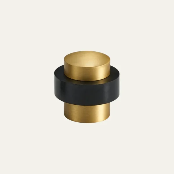 A compact solid brass floor-mounted doorstop with a domed cap and stepped cylindrical body. The three-tier silhouette gives it architectural presence despite its small footprint. A rubber buffer ring absorbs impact between the upper and lower sections.