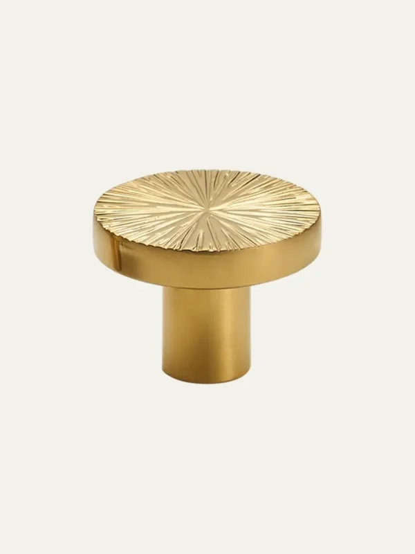 A solid brass half-moon cup pull with a radial sunburst texture across its curved face. The bold, carved lines fan outward from a single point, creating a striking decorative surface that catches and plays with light. The flat base and clean geometric profile sit flush against the cabinet face.