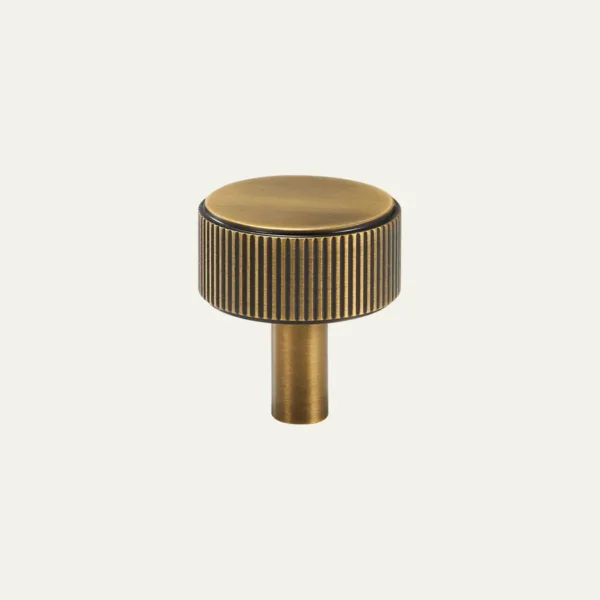 A fluted brass knob with a distinctive ridged texture and clean cylindrical form. The linear pattern catches light beautifully, adding depth and tactile interest to cabinet doors and drawers.
