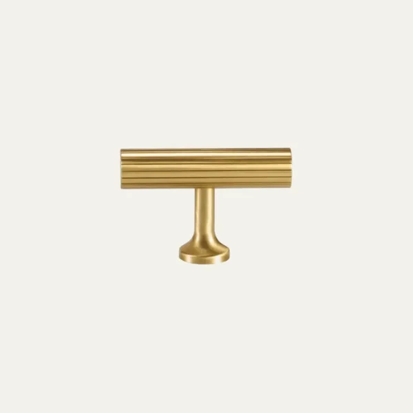 A solid brass T-bar knob with Art Deco reeded detailing. The fluted horizontal bar sits on a tapered stem and flat circular base, offering a distinctive alternative to the traditional round knob.