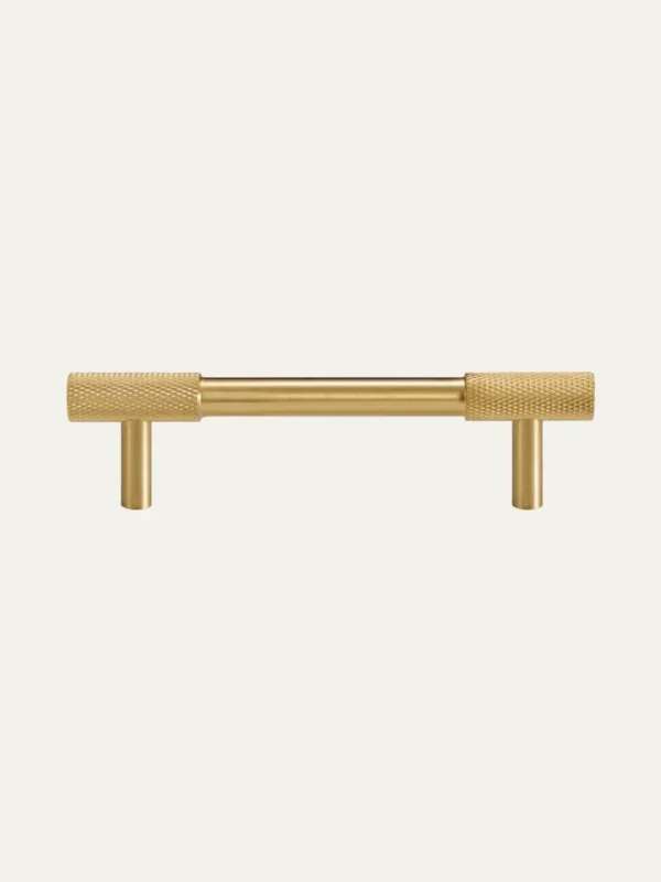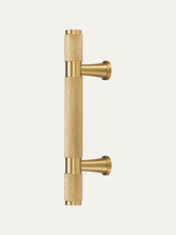 A knurled solid brass knob with a decorative stepped base that gives it a presence well beyond its size. The diamond knurling provides grip and visual texture, while the wider base adds a grounding detail that sets it apart from simpler knob designs.