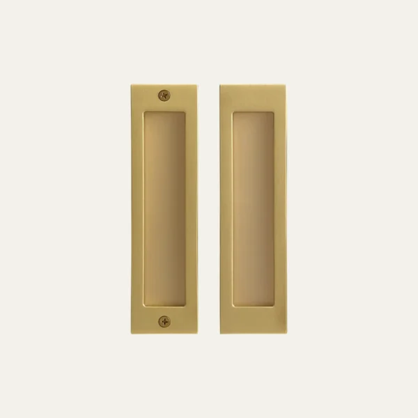 A pair of solid brass flush pull handles for sliding doors. The clean rectangular recess and minimal frame create an elegant, low-profile grip that sits flush with the door surface when not in use.